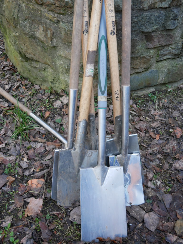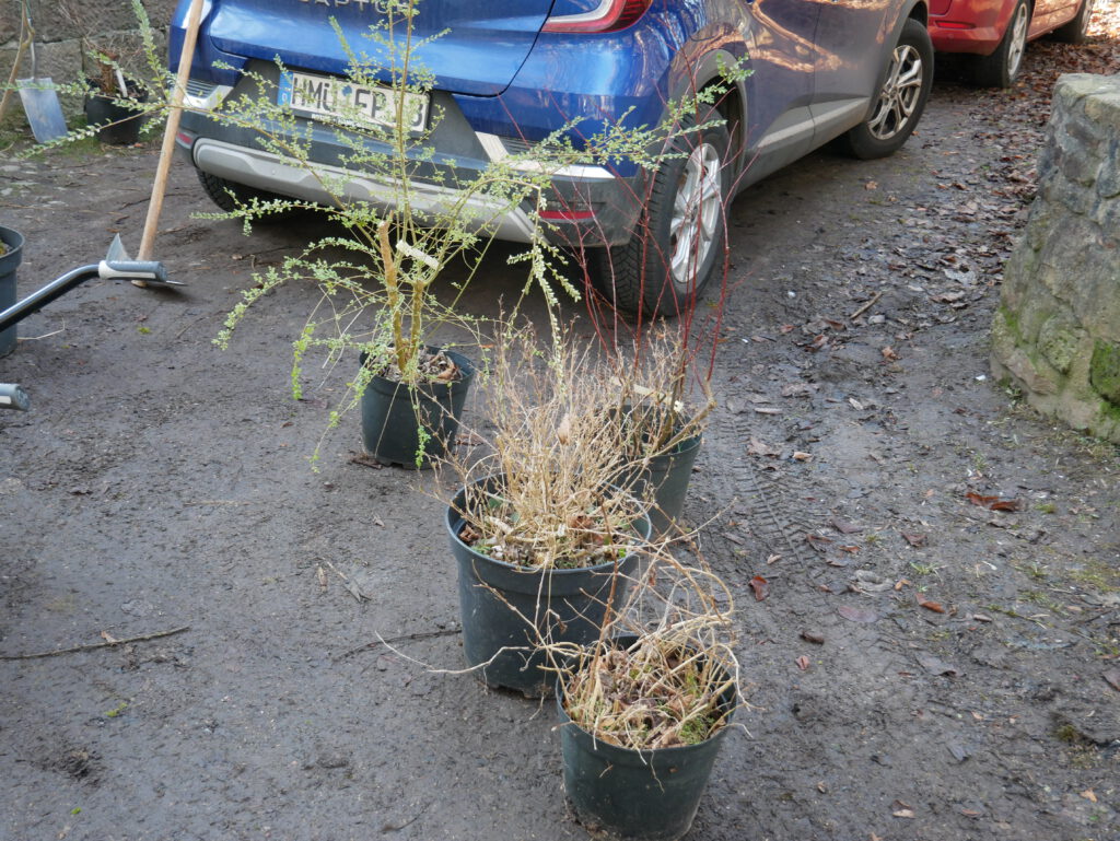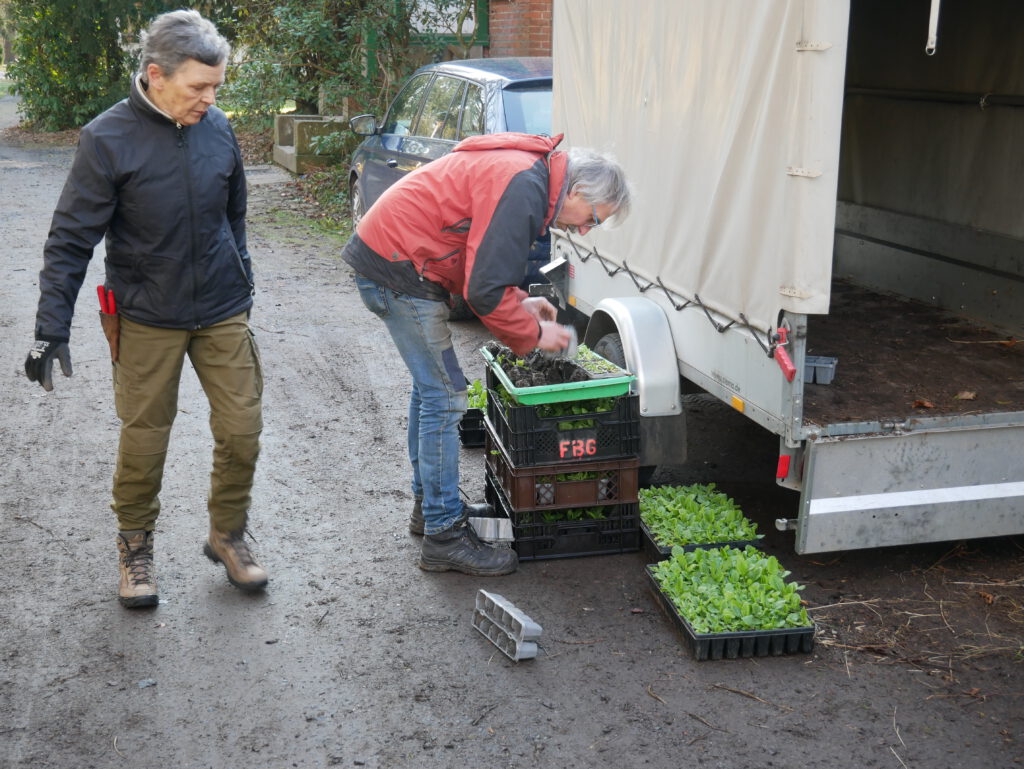 Die Containerpflanzen sind vorsortiert und das Werkzeug steht bereit. Der Boden ist frostfrei und hat nach dem Tauwetter auch genug Feuchtigkeit. Das ist wichtig, denn angießen können wir nicht. Es gibt leider keine geeignete Wasserquelle.