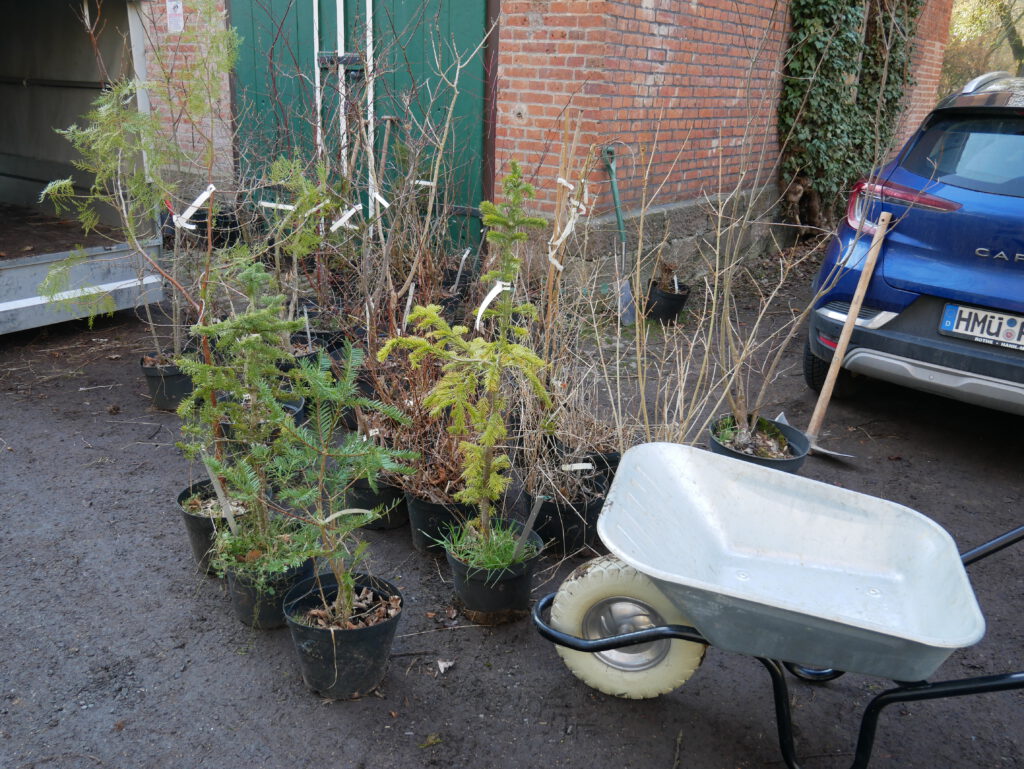 Durch Alterung, Trockenheit und Borkenkäfer sind im Forstbotanischen Garten über die Jahrzehnte zahlreiche Gehölze verschwunden. Besonders entlang der Wege machten Verkehrsscherungsmaßnahmen leider immer wieder Entnahmen notwendig. Damit der Bestand auf Dauer nicht schwindet haben wir uns zum Ziel gesetzt mit gezielten Nachpflanzungen die Lücken aufzufüllen. Dabei legt unser fachlicher Beirat Volker Meng Wert darauf, dass dies mit historischen oder botanisch interessanten Arten und Sorten geschieht. Aus dem Bestand des Forstbotanischen Garten Göttingen, dessen Leiter Volker Meng bis Herbst 2025 war, konnten wir ca. 50 Gehölze übernehmen. Nach der Wahl geeigneter Standorte war es am 3. März endlich soweit: Die Containerpflanzen wurden von Volker Meng platziert und den Helfern aus dem Verein gepflanzt.